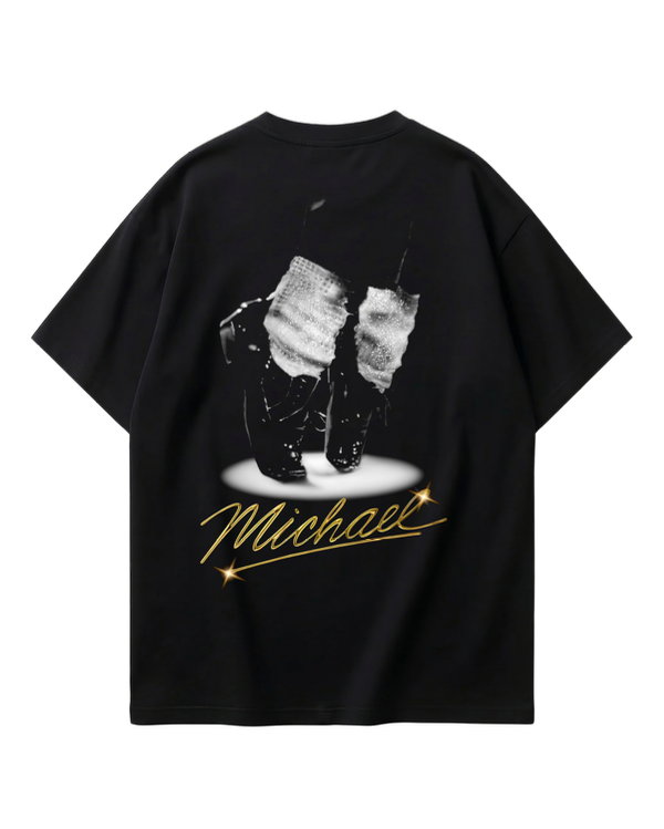 Inspirada en el impacto eterno de Michael Jackson, esta remera combina un frente minimalista con una espalda protagonista que captura uno de los símbolos más reconocibles del Rey del Pop.